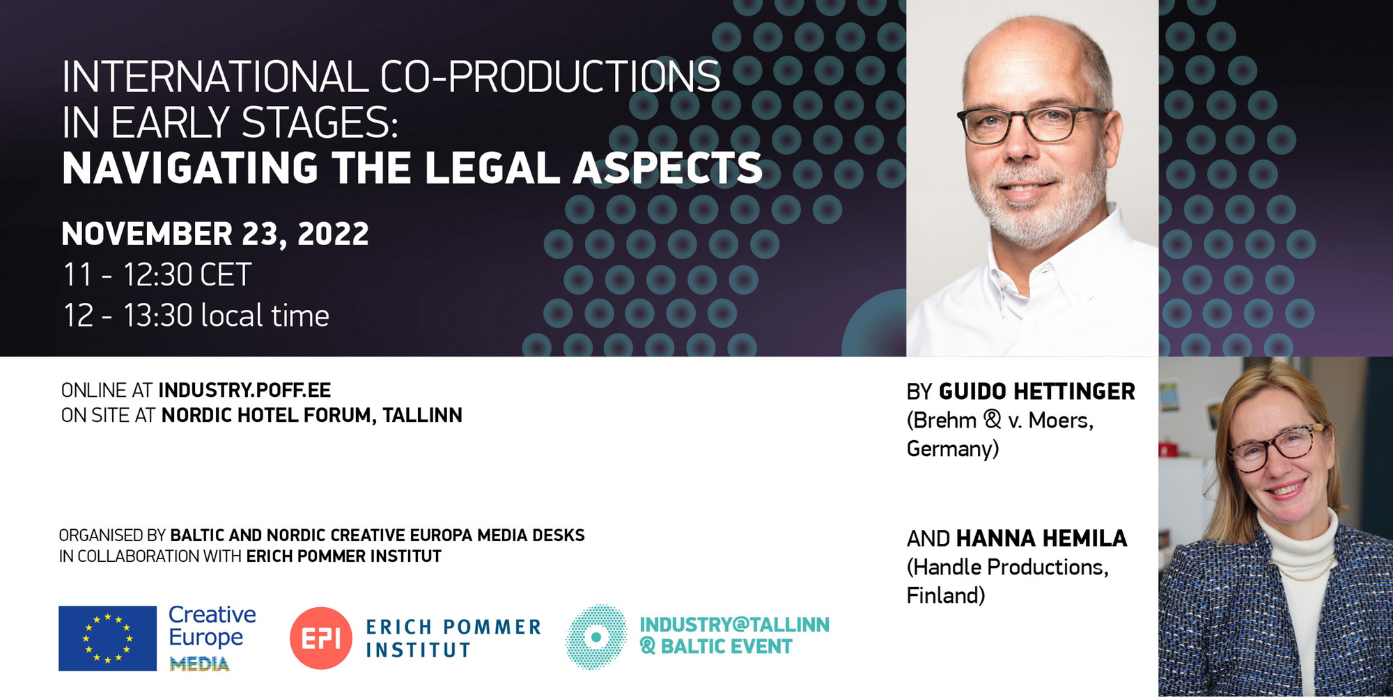 Advokaten Guido Hettinger, som har internasjonal erfaring innen det audiovisuelle feltet, går dypere inn i tematikken. Deretter følger mer praktiske innspill fra den erfarne finske produsenten Hanna Hemila (Handle Production). De mottok midler i den første runden av MEDIA-co-development ordningen som ble lansert av Creative Europe MEDIA i 2021. Diskusjonen mellom Hanna og Guido vil spinne rundt deres egne erfaringer, og vil forsøke å dekke ulike aspekter og praktiske forhold i tidlige faser av en samproduksjon.